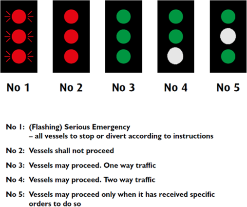 • Following the issue of a “Traffic Clearance” to a large commercial vessel, three red lights in a vertical line will be displayed on both the inward and outward traffic lights. When three red lights are displayed, no other vessel is permitted to enter or leave the harbour.