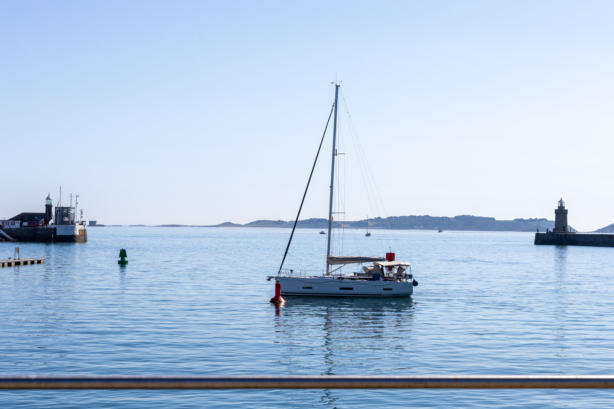 The preferred route from the North is through the Little Russel. Your initial starboard hand mark is the Platte Fougère Lighthouse, situated one mile off Guernsey’s north-east tip. Depending on your course and visibility, you can align the metal tower on Roustel with the squat flat Bréhon Tower (bearing 198°) or align Bréhon with the light on St Martin’s Point (bearing 208°). For your final approach, once the leading light at the end of St Peter Port’s breakwater aligns with the light on Belvedere (a white tower behind Castle Cornet), come onto a bearing of 220°. This approach will leave both Roustel and Bréhon to port, and Platte to starboard.
