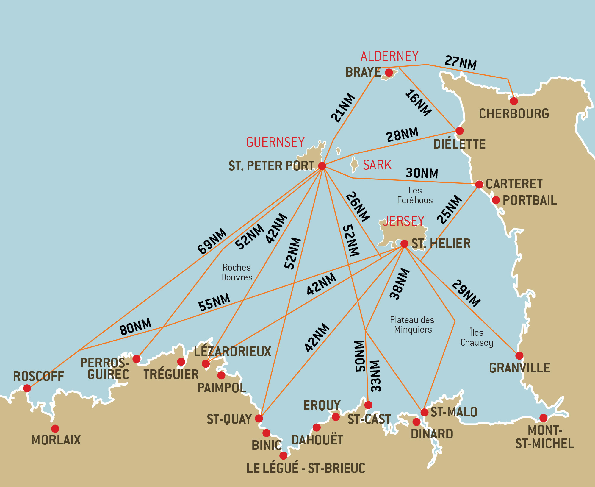 In conditions of poor visibility, the Big Russel, located between Herm and Sark, offers an alternative. It is two miles wide, clearly marked, and does not require specific transits. At night, follow the white sector of Noire Pute Lighthouse as far as the Lower Heads Buoy and then turn north-west into the Little Russel towards St Peter Port.