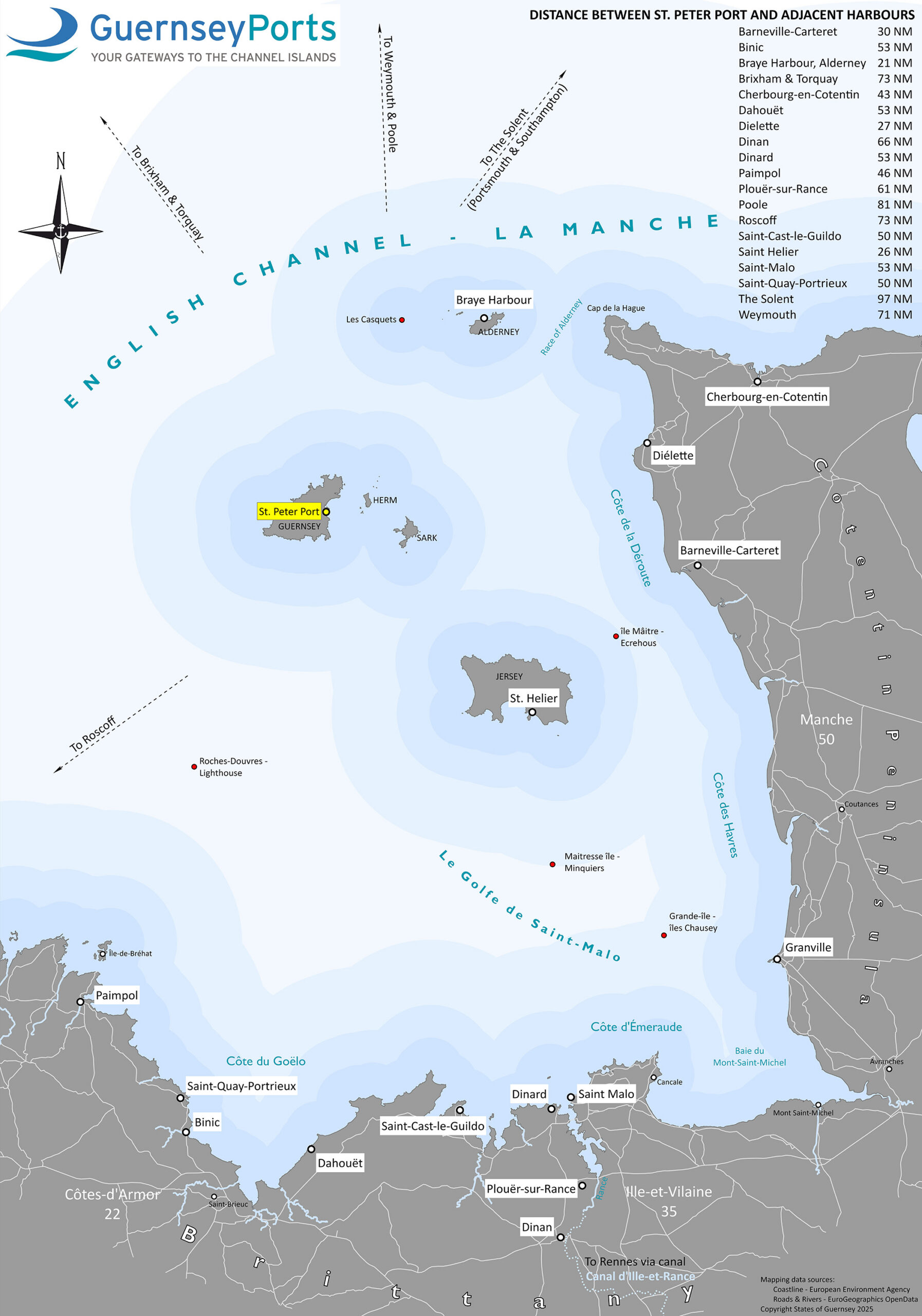 • VHF Monitoring: We recommend you keep a listening watch on VHF Channel 12. Even if your vessel is under 20m in length (i.e., not a VTS participating vessel), it is good practice to listen to Guernsey VTS on VHF Channel 12 for commercial traffic movements.
